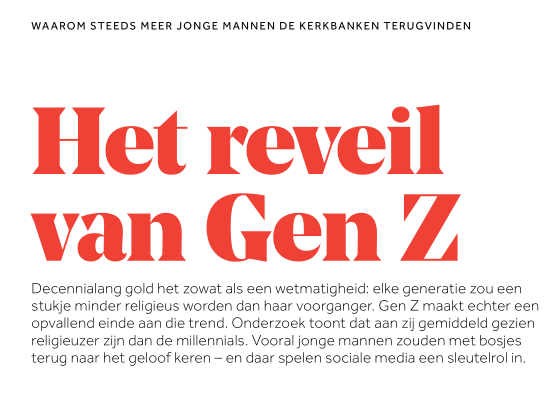 ‘Het Reveil van Gen Z waarom steeds meer jonge mannen de kerkbanken terugvinden’, Nieuwe Revu, Maart 2026.